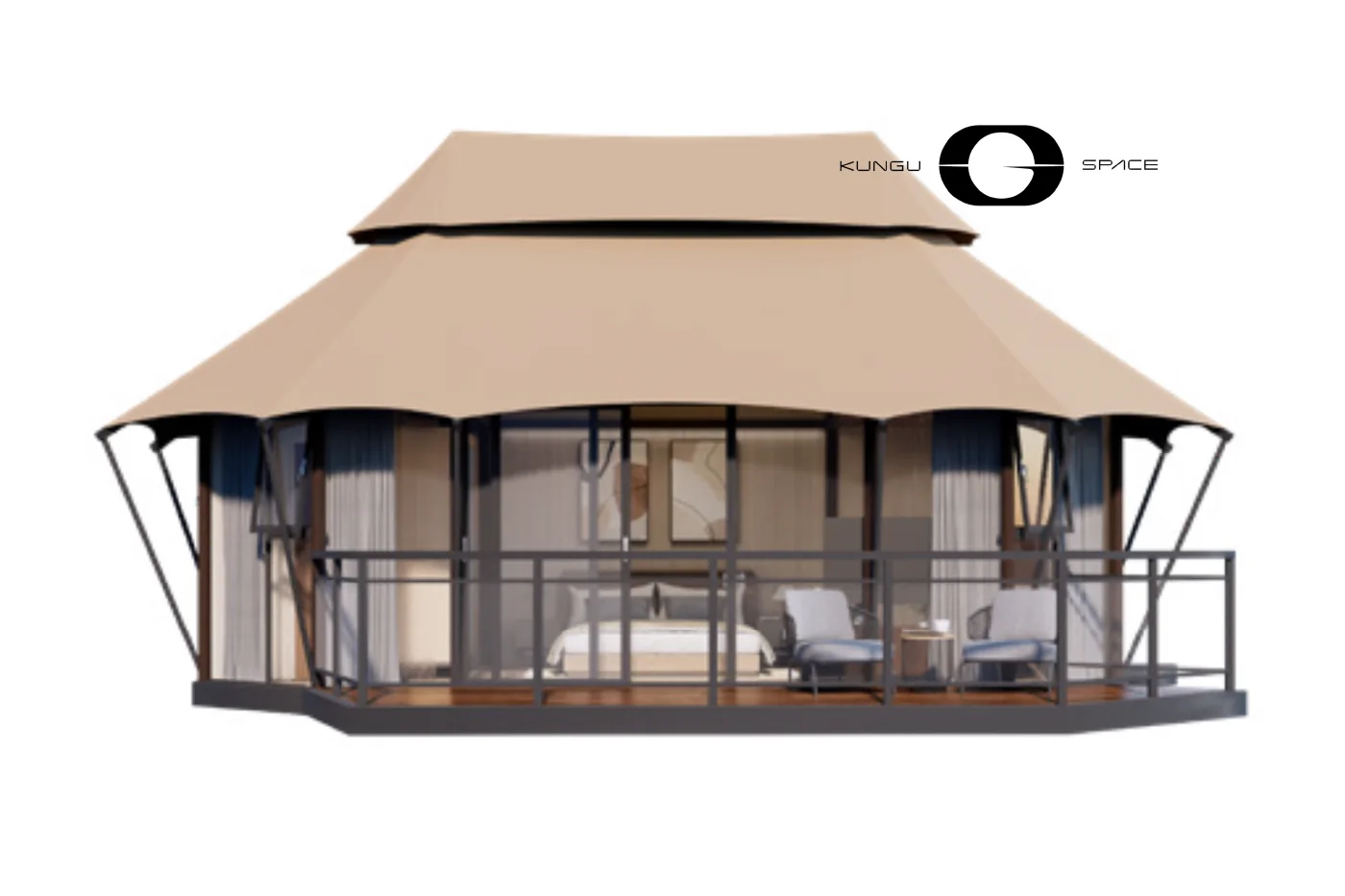 An octagonal dome design combining geometric elegance with structural stability, ideal for mountainous or scenic campsites.