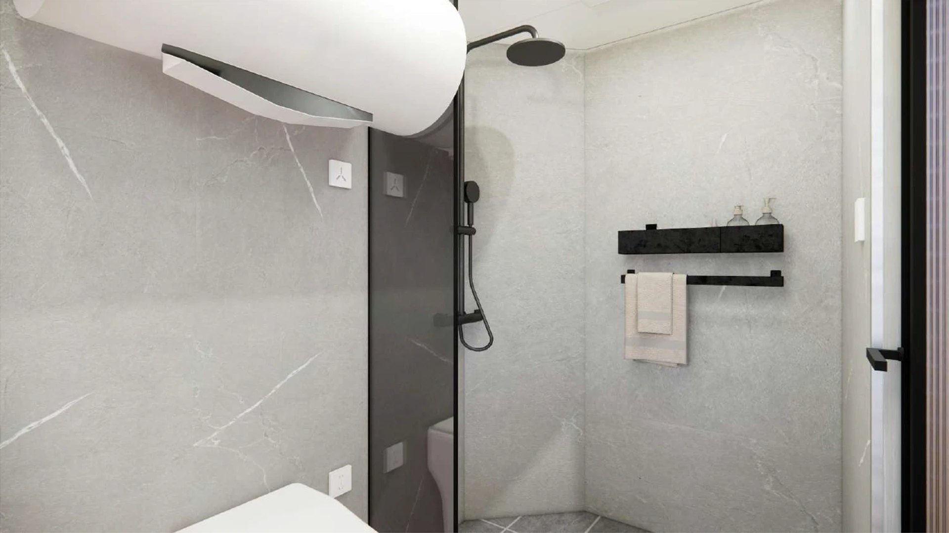 All water and electrical systems are integrated within walls. Standard and premium models include an 80L electric water heater.