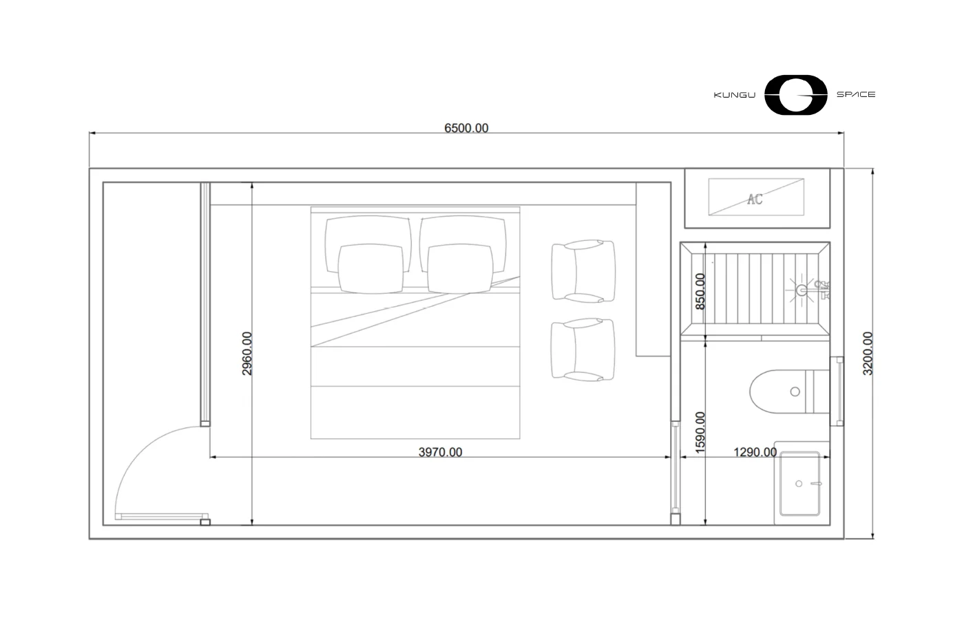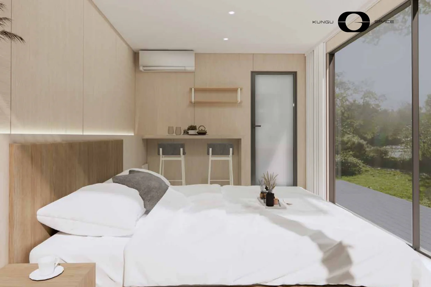 KUNGU offers various product series with different designs and sizes. Usable floor areas range from 26.7 to 35.7 square meters, with both single and double-room layouts. Customers can choose add-ons such as bathrooms, balconies, skylights, or upgrade to smart technology packages.